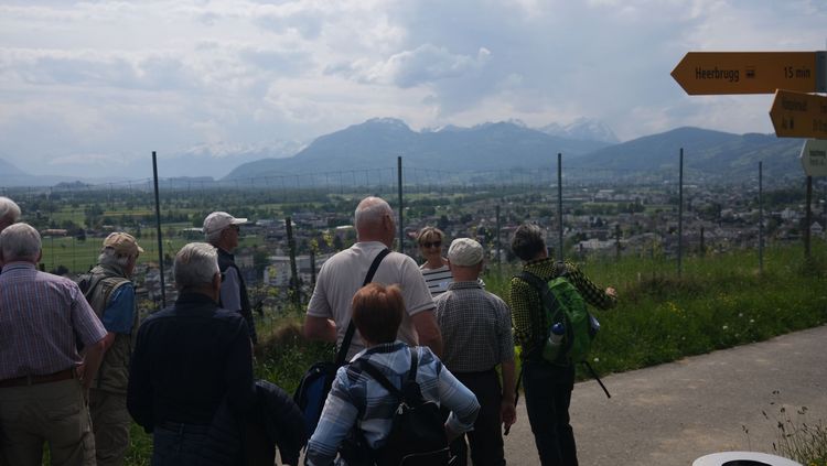Geführt von Stefan Frei, einem der Initiatoren des Industriewegs Rheintal, lief die Gruppe über das Schmidheiny Weingut zur Informationstafel Nr. 12. Die Tafeln entlang des Weges dokumentieren die Industrieentwicklung der Region. Dabei wurde unter anderem auch die Geschichte der Leica Geosystems AG und der SFS Group in Heerbrugg thematisiert. Nach diesen Eindrücken rundete eine kurze Erfrischung bei perfektem Frühlingswetter den ersten Teil des Nachmittags ab.