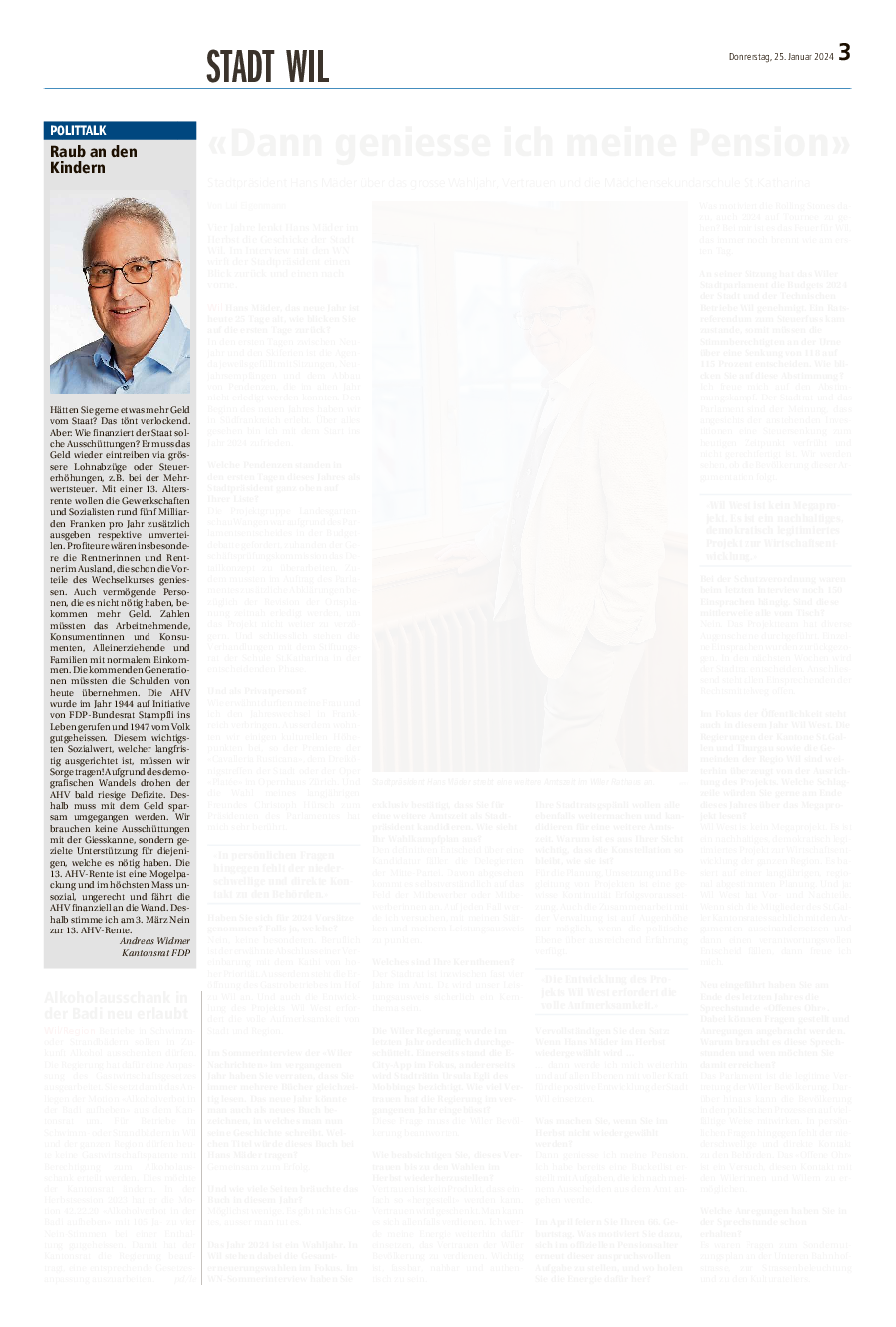 Unser Kantonsrat Andreas Widmer äusserte sich im Polittalk in den Wiler Nachrichten (Ausgabe vom 25. Januar 2024) über die 13. AHV-Rente, über die die Abstimmungsberechtigten am 03. März 2024 entscheiden dürfen. Dabei stellte er fest, dass die Aussicht auf mehr Geld vom Staat auf den ersten Blick verlockend wirkt, sich jedoch bei näherer Betrachtung als Mogelpackung herausstellt. Profiteure wären insbesondere die Rentnerinnen und Rentner im Ausland, die bereits die Vorteile des Wechselkurses geniessen. Auch vermögende Personen, die es nicht nötig haben, bekämen mehr Geld. Zahlen müssten das jedoch die Arbeitnehmenden, Konsumentinnen und Konsumenten sowie Alleinerziehende und Familien mit normalem Einkommen.